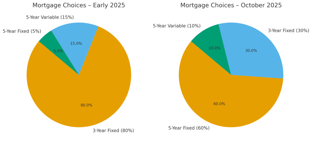 At the start of 2025, most Canadians were leaning towards short term fixed rates. Roughly 80% of our clients were locking into 3 year fixed mortgages, with only 15% choosing 5-year variables and just 5% opting for 5-year fixed terms.